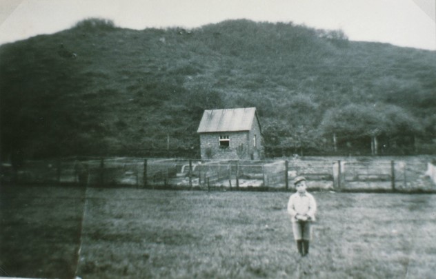 Ursprüngliches Nutria-Häuschen mit den einzelnen Buchten, etwa um 1935 aufgenommen. Im Vordergrund Walter Hild (1927–1986) (Bild von Fam. Arno Hild erhalten)