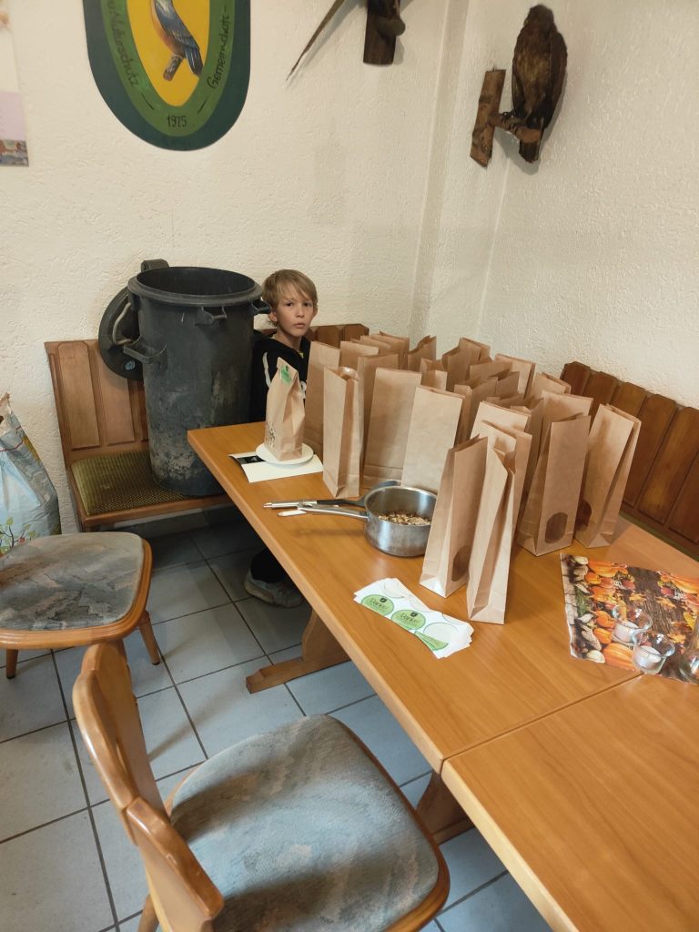 Zuerst standen das Abpacken des Vogelfutters, die Logo-Feinarbeit der Spendenbox und die Gestaltung der Jahrescollagen auf dem Plan. Die Kinder haben jede Aufgabe mit Tempo und Sorgfalt umgesetzt. Wir mussten uns als Betreuer sogar beeilen, um mitzuhalten. Während einer von uns ständig bei dem warmen Fett bleiben musste, erledigten die Kinder die anderen Aufgaben fast in Rekordzeit. Besonders beeindruckend war, wie gleichmäßig die Kinder die 500-Gramm-Futterpackungen abfüllten. Jede Packung hat jetzt das gleiche Gewicht und trägt ein kleines Dankeschön an die Unterstützer.