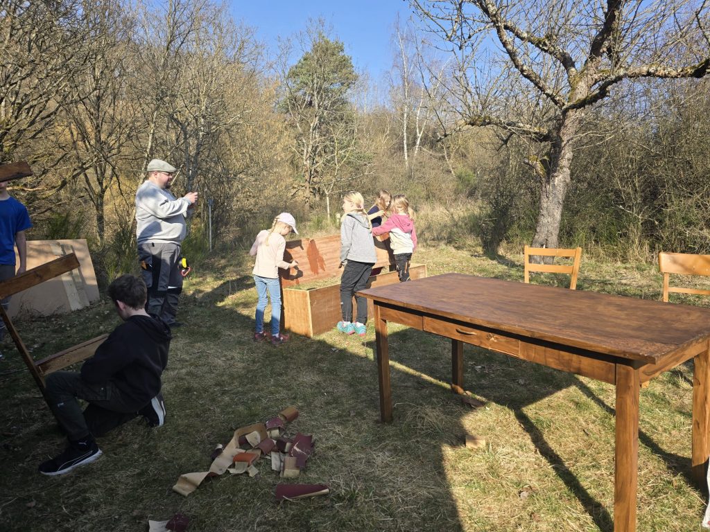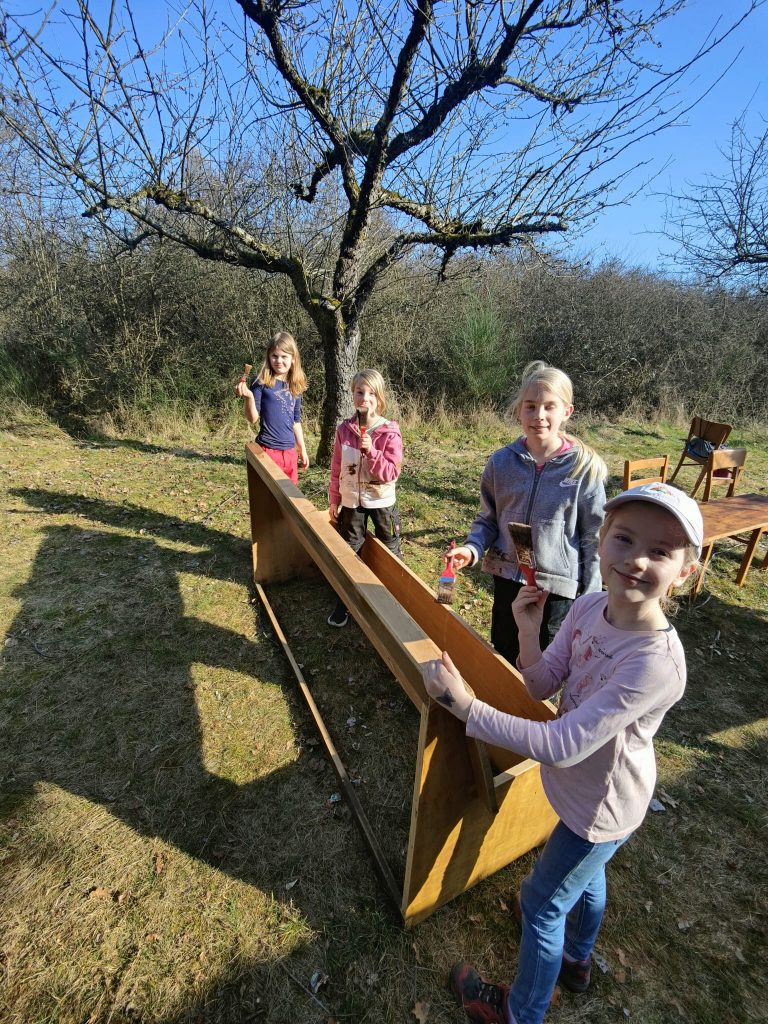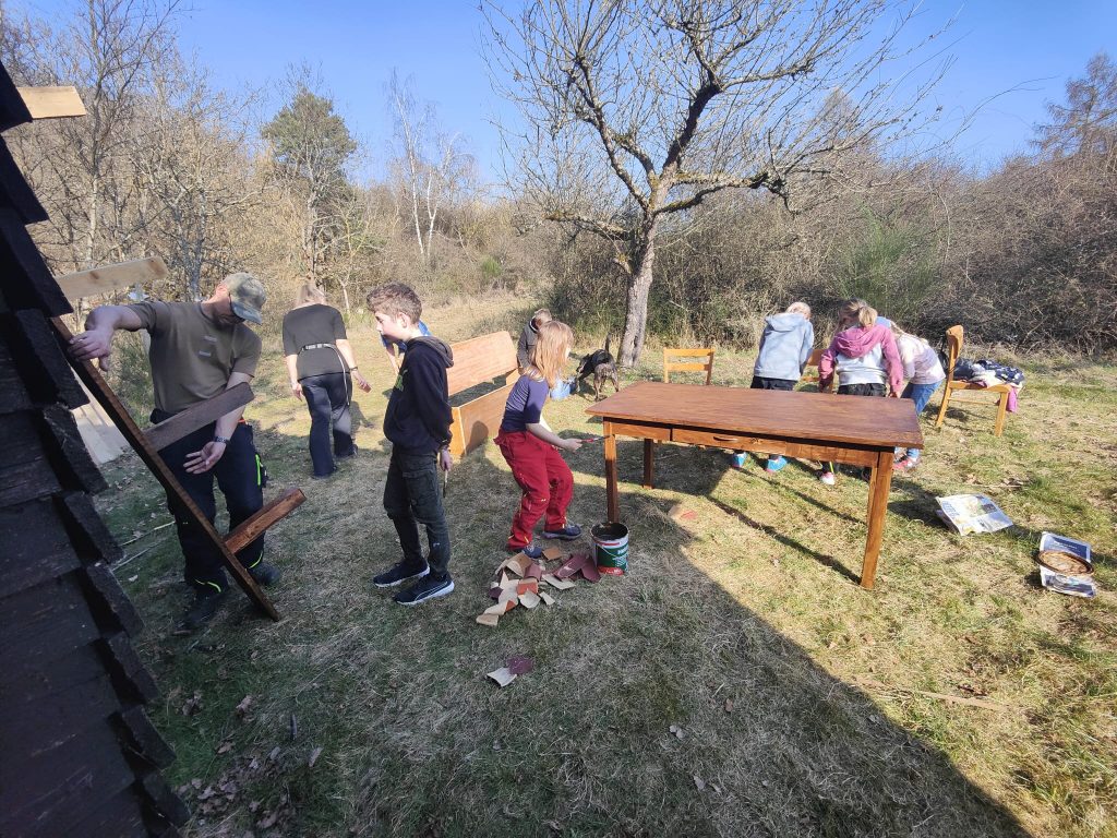 Und so wurde eine Sitzbank gebaut und gestrichen, die im Inneren bereits vorhandene Sitzbank und Tisch wurden zerlegt, abgeschliffen und erhielten einen neuen Anstrich.