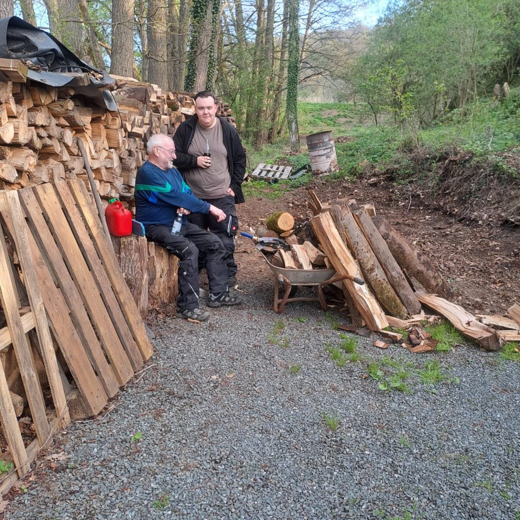 Zuerst ging es an das Holz. Mit externer Unterstützung wurde fleißig gespalten. Anschließend haben wir alles ordentlich aufgestapelt. So kann das Holz nun gut trocknen. Danach kümmerten wir uns um unseren Freisitz. Nach dem Winter wurde er wieder fit gemacht. Außerdem haben wir Bänke und Tische gründlich abgewaschen und aufgestellt.