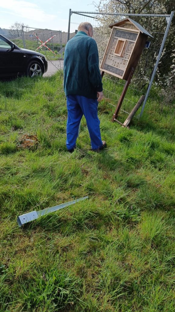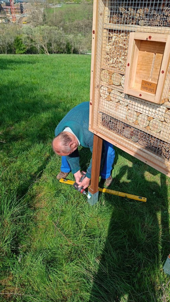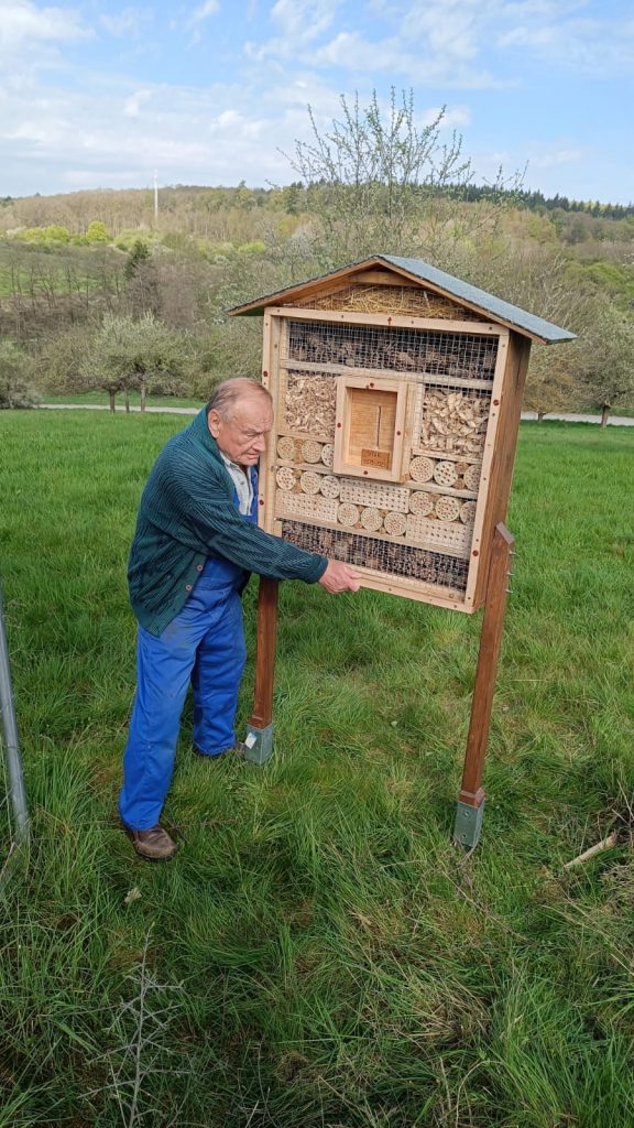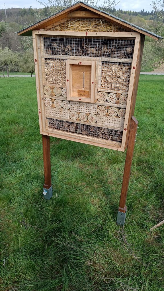 Ein besonderes Highlight bei diesem Arbeitseinsatz war unser neues Insektenhotel. Es wurde von Oswald Grieß gebaut. Gemeinsam haben wir es auf unserer Streuobstwiese „In der Kampenoh“ aufgestellt. Dort bietet es vielen Insekten einen wertvollen Lebensraum.