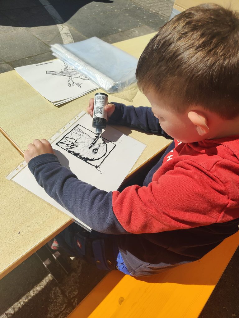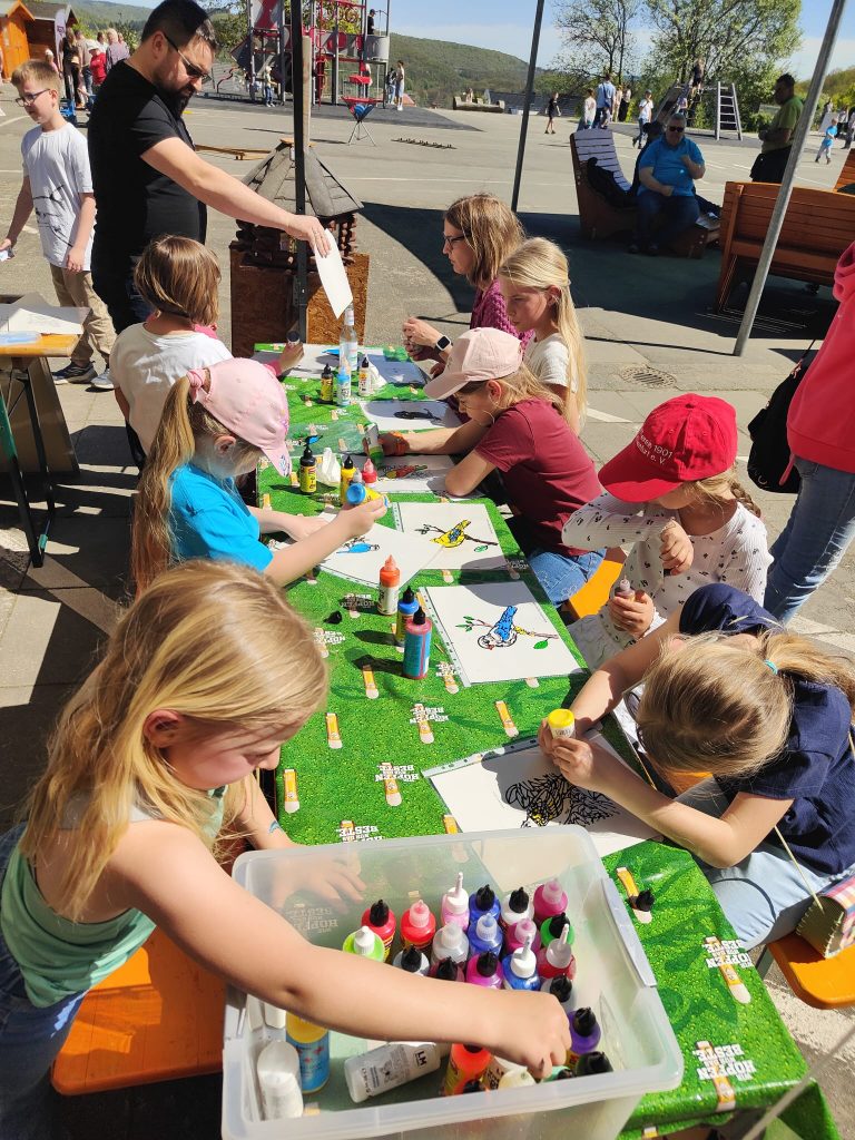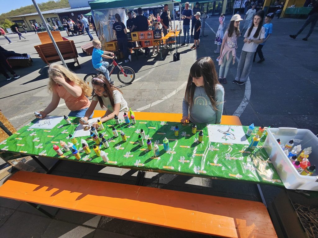Schon vor Beginn war unser Stand gut vorbereitet. Dank des sonnigen Wetters herrschte von Anfang an eine tolle Stimmung. Viele Kinder kamen direkt zu uns. Besonders gefragt war das Windowcolor-Malen. Dabei entstanden bunte Kunstwerke, die die Kinder mit nach Hause nehmen konnten.